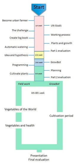 The results verified that the GrowBot technology can work as a controllable environment for some food plant growth, which was the main aim as the foundation for a novel educational robotic system. To verify the suitability and robustness of the GrowBots in school use, we performed a pilot test with 6 GrowBots in the school Tinderhøj Skole, in Denmark. The 6 GrowBots were given to a 7th grade class (13–14 years old pupils) as part of a teaching period in which they used the case “Grow green and become an urban farmer” from the teaching material. As illustrated in Figure 12, the school class went through the full process of 18 smaller educational tasks. The first 3 weeks consisted of framing the learning tasks, introduction to the work process and methodology, smaller programming tasks, etc. The following 5 weeks consisted of experimentation with growth in the GrowBots, and field work related to vegetables, and the process ended with presentation and evaluation.
