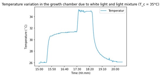 Initially, as the basis for future educational implementations, a number of fundamental experiments were performed to verify the controllability of the growth conditions in the GrowBot. Here we will look at the example of controlling the temperature. One such experiment would turn on the white light for 2 h followed by turning on white, blue, and red light for one hour. The fan and air change (1000 mL/h) would be turned ON when the temperature would exceed 35 °C. Figure 13 shows the result of this experiment. The initial temperature was 26.0 °C, and in the 2 h period of white light condition, the temperature rose and stayed at approximately 31 °C, ending at a maximum temperature of 31.4 °C. At this point, the white, blue, and red lights were all turned on, and the temperature rose to a maximum of 35.2 °C. The fan and air change turned on, and the temperature fell slightly to stay around 34.8 °C. When all lights were turned off after 1 h, the temperature again fell to the initial 26.0 °C over a time period of 1.5 h.