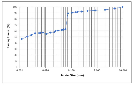The clay soil was initially stored outside the laboratory to dry naturally and then placed inside an oven for 24 h to completely dry. To prevent temperature influences on the soil characteristics [41], the-oven drying temperature was maintained at 100–110 °C. Following that, the dried clay was filtered through a 4.75 mm sieve to obtain a homogeneous sample. Figure 2 illustrates the grain size distribution of the clay. The ASTM D422-63 standard [42] was used to determine the grain size distribution of the clay. The grain size distribution, which included sieve analysis and hydrometer measurements, revealed that the sample has a consistent size distribution. Soil is composed of particles of clay (56.9%), silt (32.4%), and sand (10.7%). Table 2 presents the physical parameter of untreated clay. The liquid limit (LL), plastic limit (PL), and plasticity index (PI) of natural clay are 70.90, 27.77, and 43.13%, respectively. According to the Unified Soil Classification System (USCS), the clay soil is classified as a high plastic clay (CH) and A-7-6 according to AASHTO, which may be considered an expansive clay soil.