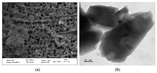 CHA micromorphology: (a) SEM magnified at 10 m and (b) TEM of CHA magnified at 50 nm [50].