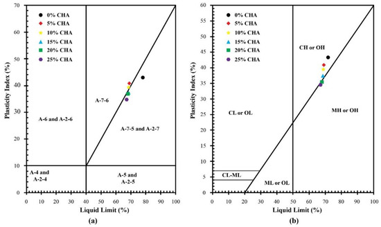 The plasticity chart in Figure 5 illustrates how the addition of CHA changes the morphology of soil grain. Figure 5a,b illustrate the plot of PI to LL used to classify clay samples according to the AASHTO and USCS methods, respectively. As the percentage of stabilizing agent applied to clay increased, the specimens moved downward and to the left from a high compressibility area to a low compressibility. Moreover, the treated samples started to shift from clay to silt soil. The overall variations in the consistency limits of stabilized clay resulted in a shift in soil classification from CH to MH and from A-7-6 to A-7-5 for the USCS and AASHTO methods, respectively. The observed results indicate that CHA stabilization caused the clay particles to form into bigger aggregates, resulting in their change to silt size particles [58]. This will probably result in a decrease in the swelling capacity of clay when exposed to water intrusion due to precipitation [1].