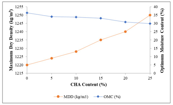 The MDD–water content plots for the CHA-treated clay are presented in Figure 7. In general, the MDD of soil samples enhanced with CHA was always above the dry unit weight of their original state. Increasing the CHA percentage to 25% improved the MDD of clay marginally by approximately 3%.