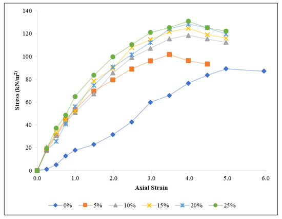 The relationship between stress and axial strain for soil–CHA mixture subjected to various CHA ratios is presented in Figure 8. Untreated samples of soil treated with varying concentrations of CHA exhibit peak stress at relatively low peak strains. Initially, the stress increases rapidly as the strain increases, until it reaches the maximum value. Upon reaching a peak, it declines with increasing strain in both CHA-treated and untreated soils. Additionally, as indicated by a decline in the axial strain, the CHA–clay mixture becomes more brittle [61].
