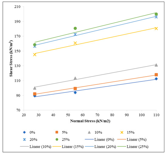 Direct shear experiments were used to obtain the shear characteristics for various mixture clay–CHA combinations. These experiments were conducted at OMC. Moreover, direct shear parameters can be used to design various types of earthen structures and to determine the bearing capacity of the soil foundation [54]. In order to achieve the specified MDD, a plain sample and mixtures of CHA–soil samples were made. The specimens were made in the shear box directly. The direct shear tests on identical samples were performed according to ASTM D3080 Standard [55] under varying normal loads to determine the cohesion and internal friction angle of shear parameters.