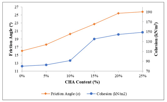 Figure 11 illustrates the CHA influence on cohesiveness and frictional angle as the percent ash content increases. The angle of friction and cohesion of the treated clay can be used in geotechnical engineering to determine the stability and strength of this modified soil. The value of cohesiveness is observed to steadily increase from 80.1 kN/m2 to 148.7 kN/m2 with the addition of CHA. The angle of friction has a similar trend, gradually increasing from 16.1° to 25.8° upon CHA addition. The soil cohesion is proportional to the force that holds particles together. Water increases the bonding force immediately. However, this cohesion increase is limited. When the moisture content of the soil is excessive, there is more filtration distributed among the particles, which may reduce cohesiveness. Moreover, increased cohesiveness is a result of certain soil minerals transforming into clay minerals during decomposition [60]. Furthermore, the increase in friction angle can be attributed to the flocculation of soil particles caused by the addition of a micro-level of CHA, which resulted in filling the space between soil particles and a pozzolanic reaction that led to higher friction angle values. The clay soil becomes coarser following the addition of the CHA.