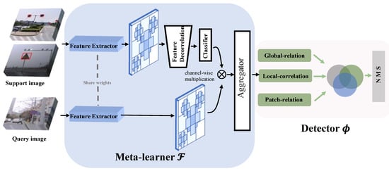 We set a learnable learning rate for all parameters so that the meta-learning system can learn good initialization as well as fast adaptation strategies. Given a query image, first the feature extractor generates its feature map and then adopts 11 convolution to make the feature map’s channel dimension compatible with the downstream modules. Unlike query feature, which retains image-level information, for support image it is necessary to extract the category features of the certain object instance. Therefore, we utilize Fourier features combined with sample weights to decouple dependencies and remove the irrelevant information present in the support set. The design of aggregator follows previous work [41], reweighting the query features according to the output of the support set class feature . The support class features are combined with query features as in Equation (8) to obtain the detection results of the corresponding category.