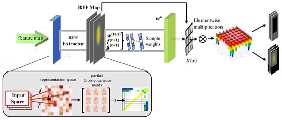 This section mainly describes the construction method of the feature decorrelation module (FDM). Inspired by [33,34,35,36], we propose a method to perceive and decouple global correlations by iteratively saving and reloading the features and sampled weights of the model. The architecture of the feature decorrelation module is shown in Figure 4.