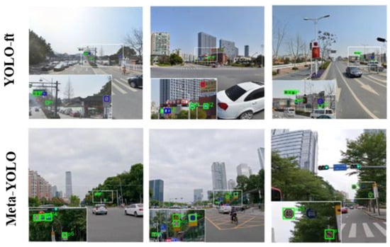 In order to ensure the justness of the experiments, in this section, the meta-YOLO proposed by us is compared with state-of-the-art methods by Han et al. [46], Min et al. [16], Zhang et al. [47] and Fan et al. [48]. The experiments were performed based on K=10 across MIST datasets, and the results on mAP50, base and novel classes are shown in Table 4. The results show that our method outperformed most algorithms. The performances of meta-YOLO were 46.2 and 51.7 on mAP50, which are the best for all methods. Fan et al. [48] combined a two-way contrastive training strategy and attention RPN to construct an object detection frame that solved the problem of the poor generalization of few-shot. Although the attention RPN method mitigates the dependence on region proposals to some extent, its framework is still RPN and the detection backgrounds are complex traffic scenes, so its performance is worse than ours with scarce training samples. It is worth noting that the meta-DETR framework proposed by Zhang et al. [47] is on a par with our model, and even better than ours in the novel class. We think this is mainly due to the semantic alignment mechanism (SAM) that, using a residual connection, aligns the high-level and low-level semantics and raises the function of regularization.