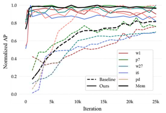 Adaptation speed. Our two-stage meta-learner model is able to rapidly learn all parameters and directions during the adaptation term. We use the AP, obtained from Equations (13) and (14), to plot versus the number of training iterations to analyze the adaptation speed of the models. Here we select the TT100K base/novel split three to train under our method and the baseline, respectively, and its AP variations under different iterations as shown in Figure 7. The results show that Meta-YOLO exhibits remarkable fast adaptation ability, shown in Figure 7. It is noted that in the experiments shown in Table 3, YOLO-based and YOLO-ft need 2.5K iterations for them to fully converge; however, ours only requires 0.1K iterations to converge to a higher accuracy.