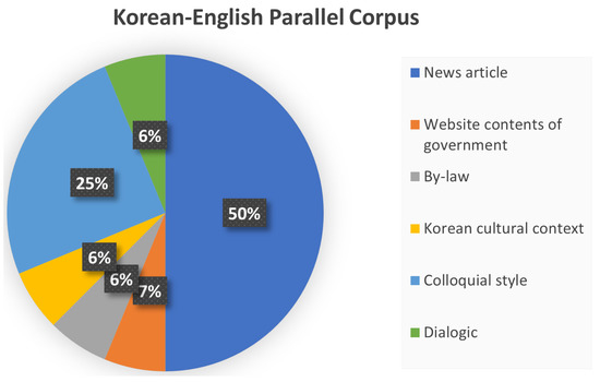 Corpus Description. The Korean–English parallel corpus (https://aihub.or.kr/aidata/87, accessed on 25 May 2022) is a parallel corpus from AI Hub, which was released in 2019. The Corresponding corpus was built through the cooperation of Saltlux partners (http://saltlux.com, accessed on 25 May 2022), Flitto (https://www.flitto.com, accessed on 25 May 2022), and Evertran (http://www.evertran.com, accessed on 25 May 2022). The total amount of sentence pairs in the constructed corpus is 1.6M, which comprises 800K news articles, 100K website contents from the government, 100K instances of by-law data, 100 K instances of Korean-based cultural contexts, 400K instances of colloquial-style data, and 100K instances of dialogic data. The ratios of each domain to the entire corpus are shown in Figure 1. It can be considered the most representative Korean–English parallel corpus, and many Korean-related studies on MT have been conducted based on that corpus [55].