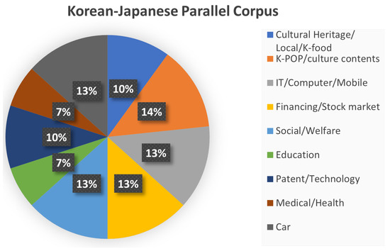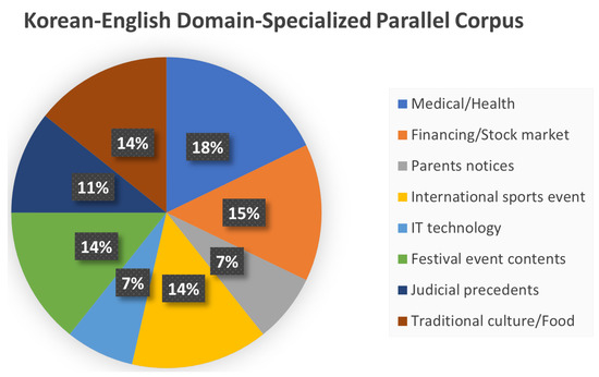 Corpus Description. The Korean–English Domain-Specialized Parallel Corpus (https://aihub.or.kr/aidata/7974, accessed on 25 May 2022) provides various parallel corpora specializing in several domains. This corpus was released in 2021, and three companies cooperated in its construction: Saltlux partners, Flitto, and Evertran.