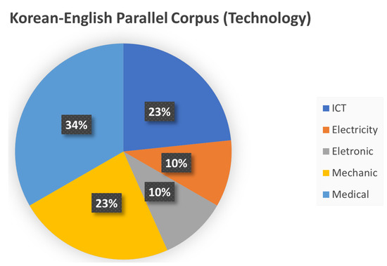 Corpus Description. AI Hub released the technology-science domain-specialized Korean–English translation corpus (https://aihub.or.kr/aidata/30719, accessed on 25 May 2022) in 2021 through the cooperation of Twigfarm (https://twigfarm.net/, accessed on 25 May 2022), Lexcode (https://lexcode.co.kr/, accessed on 25 May 2022), Naver (https://www.naver.com, accessed on 25 May 2022), the Korean telecommunications technology association (TTA) (https://www.tta.or.kr/, accessed on 25 May 2022), and the Fun & Joy company (FNJ) (http://www.fnj.or.kr/home/index.html, accessed on 25 May 2022). The corresponding corpus was constructed for the support of ICT companies with respect to the translation of technical documents or product localization.