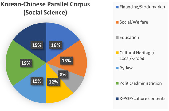 Corpus Description. Similar to the technology-science specialized corpus, the social science specialized Korean–English parallel corpus (https://aihub.or.kr/aidata/30720, accessed on 25 May 2022) was also published in 2021 through the cooperation of Twigfarm, Lexcode, Naver, TTA, and FNJ.