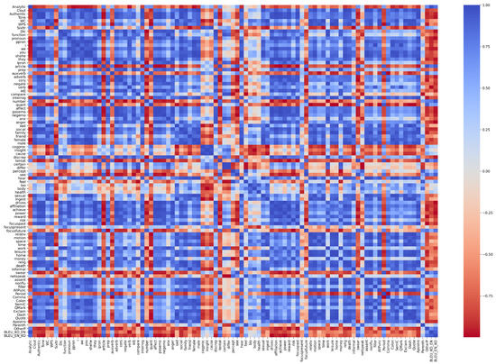 As a characteristic of the semantic perspective, the biological process category shows the lowest score compared to that of other corpora. Specifically, ‘body (body)’ figures are within 0.2% as a result of the nature of the social science domain, which is far from biology-related topics. Additionally, the cognitive process of human thinking is the highest compared to that of other corpora, with 1.5 to 1.8 times higher insight and cause. This confirms that ‘insight (insight)’ and ‘cause (cause)’ are attributes of written sentences in the social science domain in contrast to the technical science domain and specialized fields. The prevalence of ‘posemo’ is twice as high as that of ‘negemo’. Subsequently, considering the phenomenon of gender bias, male-related pronouns are approximately twice as much as female-related pronouns, similar to other corpora.