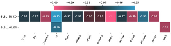 Negative correlation () results of the important factors between BLEU score (KR-EN) and LIWC features. The empty cells (white) indicate cut-offed due to the positive value. Note that this result is statistically significant as .