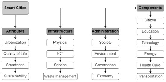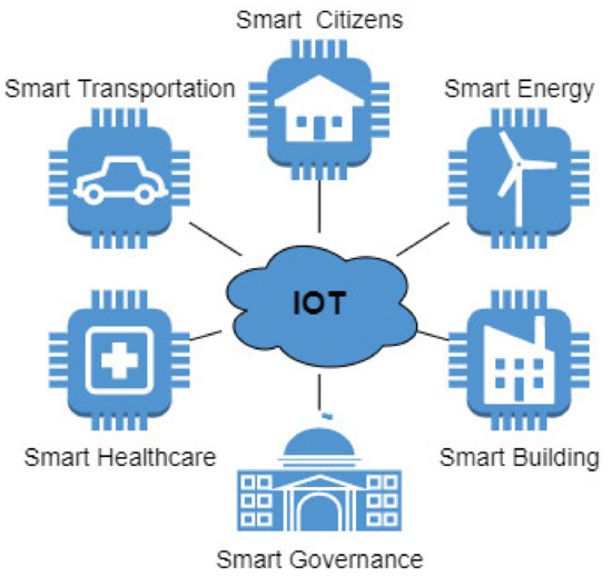 In the digitalization strategy for city governance, implementing IoT sensors and devices is an excellent way to collect data and improve public services management as shown in Figure 1. IoT devices can be integrated into the information system to increase city governance transparency, include citizens in political decisions and city problems, improve healthcare, the well-being of the city, and other aspects of human life [4]. To achieve these goals, trust in city governance and transparency is mandatory; thus, we propose blockchain technology to store and maintain public service data. Blockchain technology has desired properties for this task, such as decentralization, reliability, transparency, and security. There are numerous blockchain solutions that are helpful for different Smart City tasks, such as authentication and trust management [5], healthcare [6,7], waste management [8], and IoT sensors [9]. However, existing literature does not offer a comprehensive overview of the whole city system; it just showcases particular solutions (Table 1).