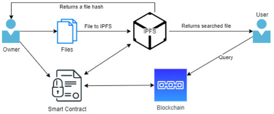 The Interplanetary File System (IPFS) is a decentralized file system for building the next generation of the Internet. Some call it a hard drive for blockchain and Web3, although its power extends much further. IPFS stores data, applications and websites and provides access to them through a decentralized P2P infrastructure. IPFS works on the principle of content addressing in which it uses cryptographic algorithms called “fingerprint algorithm”, to generate a unique CID (Content ID), i.e., content identity. IPFS can remove duplicates in its decentralized repository and generate only one fixed CID, which means one fixed document. In this way, we also eliminate any possibility of change or digital impact on the document, because each change will generate a new CID and, therefore, will not match the required. IPFS allows NFT to be generated by uploading a digital copy of a document to a P2P network and saving it forever. Although IPFS is a public blockchain, it can also be applied to privacy-seeking systems and specific participants. Due to its capabilities and technological functionalities, it is ideal for determining the ownership and change of documents in case of credibility of information and taking responsibility. It can be used as a peer-to-peer (P2P) file system in blockchain [32]. The blockchain is not suitable for storing large files since all data should be replicated on many nodes and it leads to price increasing for data storage. The IPFS can be used to store data, and it can be modified to share private data with trusted parties using smart contracts to maintain access [33,34,35].