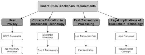 Many city governance applications, such as notary service, identity documents, and healthcare require citizens’ personal information. Malicious users can use this sensitive information to identify any individual, and, thus, data protection is the main goal and the most important task of any Smart City application. If a malicious user obtains at least 51% of processing power, he can manipulate data stored in the blockchain network. It is necessary to apply the GDPR (General Data Protection Regulation), among other things, when consolidating and merging databases. Blockchain technology is not legalized for some applications in city government affairs, for example, legal documents, licenses, etc. Therefore, using blockchain applications without legalization will raise legal implications, so it is important to ensure new law regulations, as shown in Figure 5.