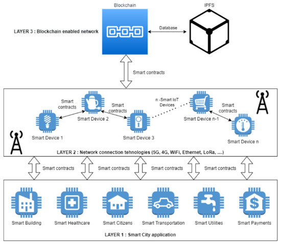 The blockchain solution for Smart City is divided into three parts; the first part comprises all city applications such as waste management, healthcare, traffic, and other applications important for city governance, as shown in Figure 6. The second part is network devices (IoT) and communication networks responsible for collecting and data sharing. The final part is the blockchain network for data storage after reaching a consensus among the trusted nodes in the network depending on selected consensus protocols. For each node on the network, smart contracts are defined, and if a node agrees with the rules in smart contract, information is stored in the blockchain [43].