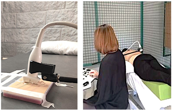 The ultrasound measurements were made by a VINNO E35 ultrasound device with a linear 5–13 MHz probe and a 48 mm footprint. The measurements were made post-acquisition in a computer with the Fiji software (version 2.3.0, National Institutes of Health, Bethesda, MD, USA) [29]. Two groups of variables were analyzed in lumbar multifidus muscles, morphometrics (thickness, contraction time, and cross-sectional area CSA), and densitometric (histograms). The probe was placed on the patients using a microphone holder (Figure 1), and the position was checked using a clinometer to ensure verticality. The measurements were made on patients and phantoms as a comparator due to the unchanged characteristics.