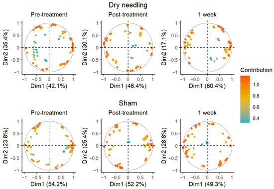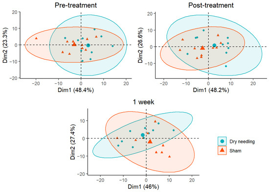 The principal components graph of the subjects in each group and measurement shows how the patients form two distinct clusters, especially at one week. This seems to indicate that the overall differences between the two groups increase over time, and they are more evident after one week (Figure 3).