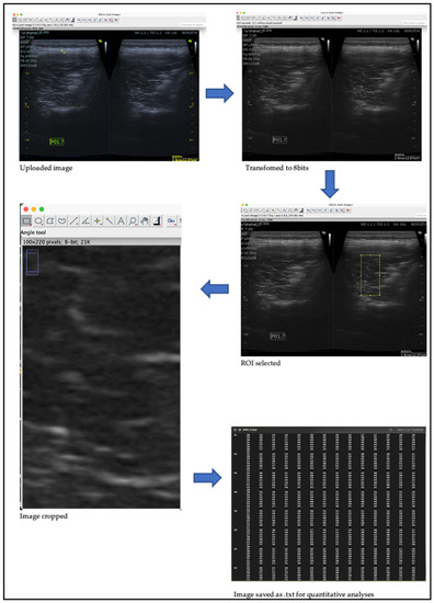 For the histogram analyses, a manual region of interest (ROI) was cropped in 100 × 220 pixels dimensions in the middle of the multifidus muscles bulk to ensure that it would fit in all samples. The image process is detailed in Scheme 1. The mean, standard deviation, variance, and kurtosis/skewness (of the histogram graph) were calculated, considering this parameter as first-order parameters associated with the grey levels of each pixel. The second-order parameters started by applying a macro (Supplemental Materials), which was made and batched to extract the matrixes for posterior analyses on the spatial distribution of pixel grey levels from different methods as detailed: