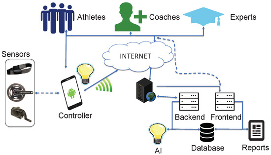The input data of the feedback system is modelled to be originating from sensors (e.g., heart rate monitors, accelerometers, strain gauges). There is no conceptual restriction to the connection type of the sensor and the number of used sensors. Furthermore, the term sensor is used in a broad sense, and a sensor could also be used to provide data in the form of a survey presented to an athlete. Additionally, a sensor could take the form of fitness equipment not worn on the body, such as smart indoor cycling trainers. Data from the client are pushed to the server using a high-level interface.