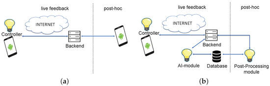 Figure 2. (a) Feedback provisioning on the mobile client. (b) Server-side feedback provisioning. Illustration of feedback provisioning within Direct Mobile Coaching. (a) Feedback is provided by a controller during the activity. A controller can communicate with the backend. Furthermore, after the activity, feedback can also be provided by the client and communication with the backend is possible. (b) Feedback can be provided by an AI module, which can also be in communication with a controller on the mobile device. Furthermore, post-processing modules can provide feedback after the activity has finished.