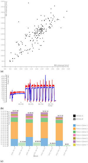 Figure 3. (a) Example of a Poincaré plot as shown by the Web-Frontend. (b) Example of a line chart as shown by the Web-Frontend. (c) Example of a report as shown by the Web-Frontend. Example charts generated by the framework.