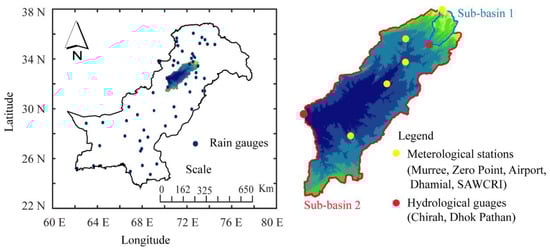 The Soan River, initiating from the Murree highlands, is a major tributary of the Indus River and a key hydrological entity of the Potohar region of Pakistan. The Soan River flows through Chirah and Dhoke Pathan hydrological gauging stations (Figure 1) before being a part of the Indus River. The total drainage area of the Soan River basin is 6842 km2 with an elevation ranging from 265 to 2274 m. The Soan basin is characterized by gentle to the steep slope and monsoon fed streams which generate almost all of the basin flow with mean annual precipitation of 1465 mm, and the mean annual temperature ranges from 8 to 22 °C. The Simly Dam, which spans the Soan River, provides drinking water to Islamabad, Pakistan’s capital, as well as water for irrigation activities in the Pothohar region [32]. Furthermore, for a better understanding and evaluation of the spatial variation of drought, the study area was divided into two sub-basins: Chirah (hereafter sub-basin 1) and Dhoke Pathan (hereafter sub-basin 2). In the current study, monthly precipitation data of five meteorological stations within the basin (Murree, Zero Point, airport, Dhamial, and SAWCRI) from 1983 to 2015 was collected from Pakistan Meteorological Department (PMD). The average value of four stations lying in sub-basin 2 was used to estimate the meteorological drought in sub-basin 2, whereas the data of the remaining one station, i.e., Murree was used for meteorological drought analysis at sub-basin 1. Similarly, the monthly streamflow data of two hydrological gauging stations, i.e., Chirah and Dhoke Pathan was collected from Water and Power Development Authority (WAPDA) for the same period.
