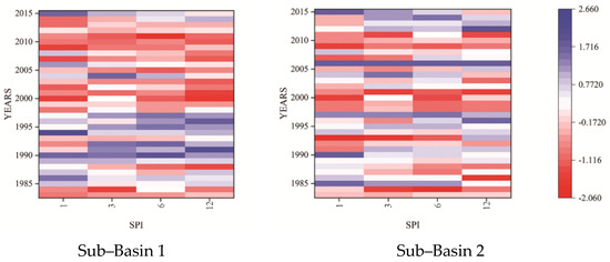 Figure 2 illustrates the meteorological drought index calculated at selected time scales for both sub-basins of the study area. Based on the analysis, it was observed that there was an increase in the frequency of drought after 1998 specifically in the case of sub-basin-1 when SPIs mostly remained negative. These results are in good agreement with the results previously published on droughts in Pakistan [19,20,23,29,39]. The variations in drought between both sub-basins are due to the more relative decrease in precipitation in subbasin-1, compared to sub-basin-2 [30,32]. Moreover, the numbers of drought events were different at different computed time scales. Significant inconsistencies were found when the 3-month time scale was compared with the 6-month time scale, and a comparison between the 6-month and 12-month time scales gave slight variations in results. Results reveal the frequent occurrence of severe drought events at each sub-basin of the study area, and these were more sensitive to short-term drought compared to long-term droughts. According to the results, the recurrence of drought is more frequent and consecutive at 1 to 6 months’ timescale in sub-basin 1 and during the 12-month timescale, there exists a sharp difference between wet and dry episodes. while the sub-basin 2 is found to be more sensitive to drought (mild to severe) at a 1-month timescale as compared to 3, 6, and 12-month timescales. The results also specified that the drought events state varied with the increase in SPI time scales, mostly a declining trend in sub-basin 2. This is due to the reason that computation of 12-month time scale SPI involves the aggregation of total precipitation from October to September and includes both wet and dry seasons. However, the 3-month SPI time scale considers only the sum of three-month precipitation, and the 3-month time scale (March-May) of the study basin was normally a dry season.