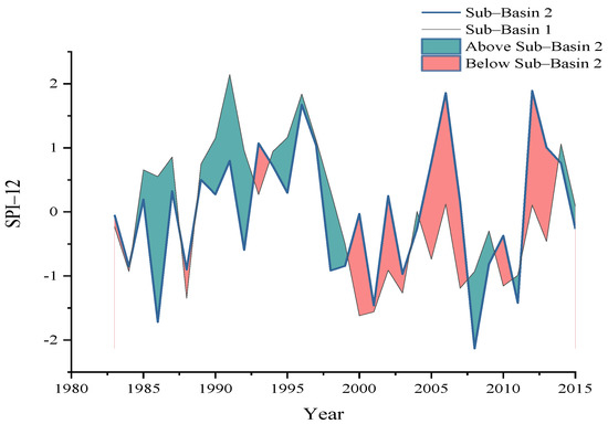 Difference in meteorological drought (SPI–12) severity at both sub-basins representing the spatial variations across the Soan river basins.