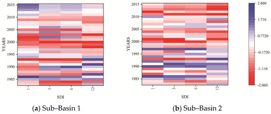 A moving average analysis was performed at multiple time scales to better assess the correlation between SPI and SDI, see Figure 7. Results show that the variations of SPI and SDI were quite comparable; however, the differences between them do exist. In general, a strong correlation was observed between SPI and SDI at the upstream sub-basin 1, i.e., CC = 0.66. Overall based on the correlation analysis with different lag times, it was observed that at both sub-basins, the SDI was 1 month lagging behind SPI at 3-month and 12-month time scales and 2 months lagging for 6–month and 9-month time scales. This period of lagging time was in accordance with the prior study [7].