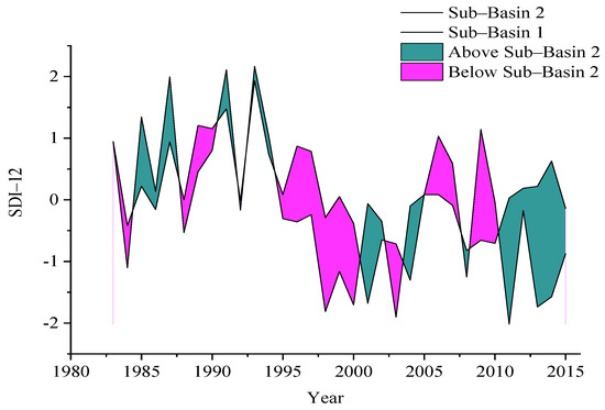 Figure 4 depicts the temporal variations of hydrological drought periods in sub-basins 1 and 2 at different time scales, indicating the occurrence of hydrological drought over the last three decades. Hydrological drought, like meteorological drought, was more sensitive to short-term droughts than long-term droughts. Drought events occurred continuously from 1983 to 2015, with the driest period for the study area being 1998–2004. Drought patches were also randomly observed in 1993, 1998–2004, and 2009. Sub-basin 1 was stressed by hydrological drought, and the number of drought events was high from 1985 to 2004, with a slight wet condition from 2005-to 2015. However, in the case of sub-basin 2, the results showed that the frequency of hydrological drought events was increasing in the basin from 1983 to 2015. Figure 5 shows the illustration of the difference in hydrological drought severity (SDI-12) for two sub-basins and indicates notable variations across the two sub-basin. Furthermore, based on the MK test, a statistically significant trend was observed for downstream sub-basins 2 with a Z-value of 1.83, whereas, upstream sub-basin 1 showed opposite behavior with an insignificant statistical trend. However, there still exists an increasing trend of drought at upstream sub-basin 1.