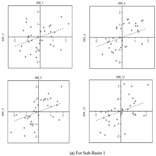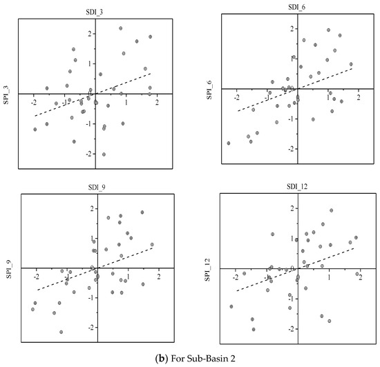 The coefficient of determination (R2) and regression coefficient (a) extracted from linear regression equations (Table 1) showed that a significant relationship existed between SDI and SPI, and it increased up to the 9-month time scale and then decrease in the case of the 12-month time scale. The coefficient of determination (R2) of the 6-months and the 9-month time scale was relatively higher as compared to the other two time scales. Moreover, the correlation of SPI and SDI was higher at upstream sub-basin 1 of the Soan River Basin as compared to downstream. For instance, sub-basin 1 and sub-basin 2 had 0.66 and 0.63 values of R2 based on a 9-month time scale respectively. The regression lines with the related data points are shown in Figure 6 which may be utilized for the prediction of hydrological droughts using the meteorological droughts information.