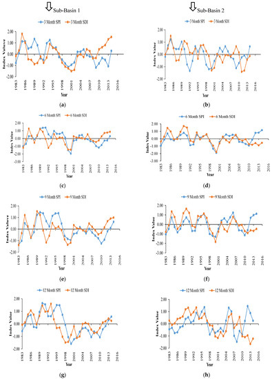 Moving average analysis for lag time identification between SPI and SDI at sub-basins 1 and 2 for different time scales. (a,b) 3 months, (c,d) 6 months, (e,f) 9 months, (g,h) 12 months.