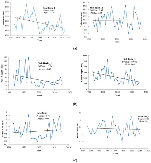To further justify, a trend analysis of precipitation, runoff, and runoff coefficient had been performed. The analysis resulted, in the case of sub-basin 1 a declining trend in precipitation was observed during the years 1983–2015, as shown in Figure 8a. For instance, the average annual precipitation decreased from 1983–1997 (1950 mm) to 1998–2015 (1570.50 mm). This decline in precipitation was significant in sub-basin 1, while little variation (no significant trend) was found in the case of sub-basin 2 with an average value of 1115 mm and 1065 mm for 1983–1997 and 1998–2015 respectively. For sub-basin 1, the annual runoff depth had a decreasing trend (i.e., an average of 174.44 mm for 1983–1997, and 84.00 mm for 1998–2015) during the study period (left panel Figure 8b) and, the runoff coefficient had no significant trend (left panel Figure 8c). Similarly, in the case of sub-basin 2, runoff depth has a decreasing trend, while runoff coefficient has no significant trend as the p-value is greater than alpha. The variations in the trend direction of runoff, and runoff coefficient in the case of sub-basins 1 and 2 could be mainly due to land-use changes, e.g., 71 km2 and 1611 km2 increase in agriculture land was observed in sub-basins 1 and 2 respectively from 1983–1997 to 1998–2015 [30].