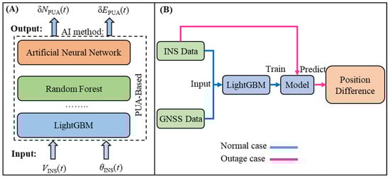 PUA-based LightGBM machine learning model. (A) Position update architecture (PUA), t—time; VINS(t)—Velocity provided by INS at t; θINS(t)—Heading angle provided by INS at t; δNPUA(t)—Latitude difference between epoch t and epoch t − 1; δEPUA(t)—Longitude difference between epoch t and epoch t − 1; (B) Scheme of the LightGBM machine learning model based on the PUA.