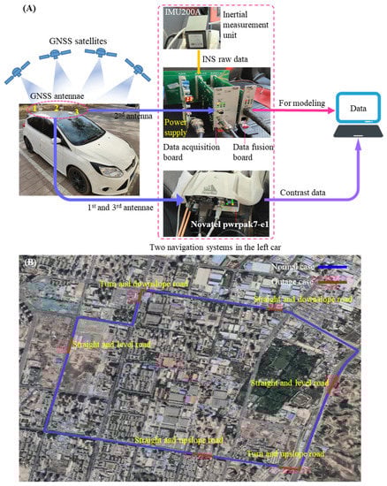 Experimental device and method. (A) Two integrated navigation systems, 1—1st antennae; 2—2nd antennae; 3—3rd antennae; (B) closed-loop experimental road trajectory.