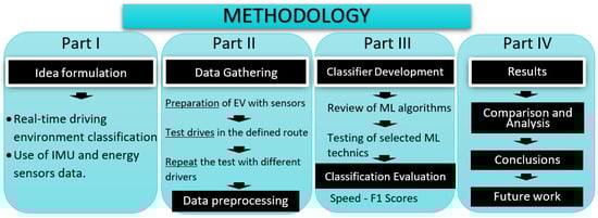 This paper is organized as follows: Section 2 describes the previous works, and the state of the art is presented in Section 3. Section 4 presents the methodology employed in this work and details of the experimental data acquisition including the EV used for the tests, the route, and the sensors. Section 5 presents the features used and the data pre-processing. Section 6 describes the data analysis and the initial classification with Machine learning algorithms. Section 7 presents further classification tasks while also discussing its results. Finally, the work’s conclusions are drawn in Section 8 and future work is proposed in the last section.