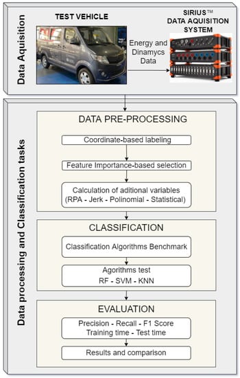 The collected data was then analyzed and processed for it to be later used in training and testing datasets for machine-learning algorithms. The three zones to be classified were first labeled by using GNSS coordinates associated to each data sample. Then, the GNSS information was removed before training the classification algorithm so that it relied on the vehicle’s dynamics and energy consumption information as the only available features. This information can be pre-processed to enhance the ML algorithm performance. This pre-processing includes the selection of the best input features and the combination of them, followed by statistical values calculation.