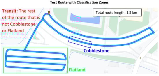 The acquisition of data was performed by using a Dewesoft’s SIRIUS data acquisition system, which included the DS-IMU/GYRO modules and sensors. The test circuit was divided in three zones: “Transit”, “Flatland”, and “Cobblestone”. These zones are shown in Figure 4 and are described as follows: