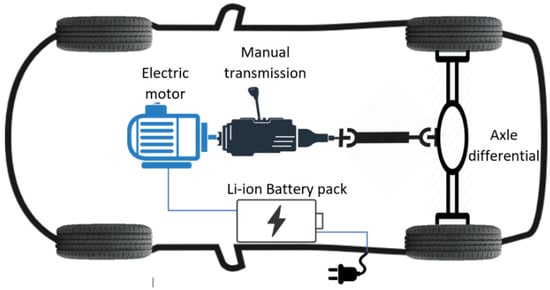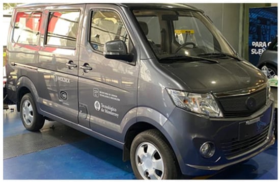 The vehicle used for this work is a custom Battery Electric Vehicle (BEV) available at the Research Center for Automotive Mechatronics (CIMA) (Figure 6) at the Tecnológico de Monterrey University in Toluca, México. This test vehicle is a FAW-G60 that features an electric powertrain. The powertrain consists of a three-phase 72 volts induction motor, a 5 velocities gearbox, and a mechanical differential. Details of the motor and the battery are shown in Table 2. Furthermore, the powertrain’s architecture is displayed in Figure 7.