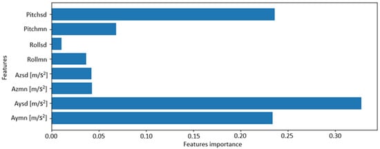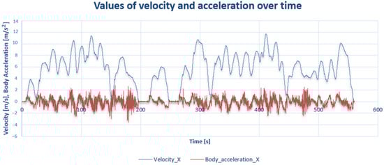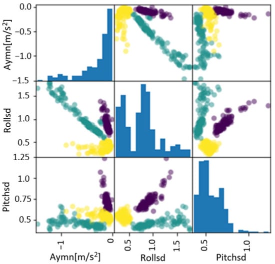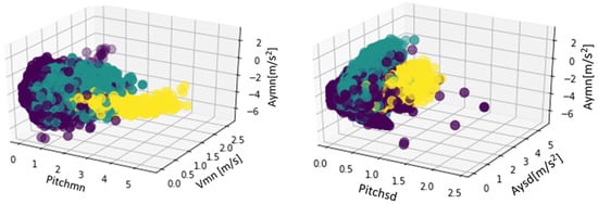 The measurements of lateral velocity and acceleration can provide information of movements that are being performed on the y axis, such as lane changing and other characteristic maneuvers of certain environments, e.g., low-speed collision avoidance and continuous lane changing, both characteristics of high traffic urban environments. Another variable related to the change of the vehicle direction is the angular displacement around the z axis, also known as heading. The heading provides information on the vehicle’s turning maneuvers in angular magnitudes. Differentiation of the heading variable in time produces a well-known magnitude, the yaw rate. The yaw rate provides information on the vehicle-rotation velocity around its z axis, and it is a valuable factor in vehicle stability assessment. The heading was not directly used as a feature in this work due to it acting as a “compass” that precisely gives away the vehicles’ orientation relative to that at the starting position and can be considered data leakage.