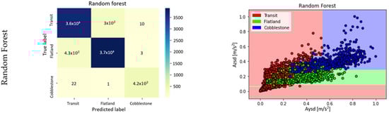 For the classification of the road, three previously defined labels were used, which are “Transit”, “Cobblestone”, and “Flatland”, which correspond to the distinguishable zones of a route inside the Toluca campus of the Tecnológico de Monterrey. Eight different drivers aged between 22 and 30 years participated in these tests. The total number of samples collected from the three classes was 476, which consisted of complete travels around the defined test route.