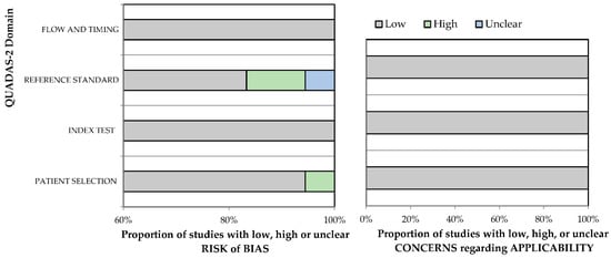 - Whiting, P.F.; Rutjes, A.W.S.; Westwood, M.E.; Mallett, S.; Deeks, J.J.; Reitsma, J.B.; Leeflang, M.M.G.; Sterne, J.A.C.; Bossuyt, P.M.M.; QUADAS-2 Group. QUADAS-2: A Revised Tool for the Quality Assessment of Diagnostic Accuracy Studies. Ann. Intern. Med. 2011, 155, 529–536. [Google Scholar] [CrossRef] [PubMed]