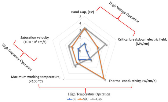The inverter is the fundamental part of an EV; it drives the car’s electric motor by controlling the power flow of the battery. The primary concerns for the design of PECs are reduced power losses, high efficiency, less input/output current ripples, reduced size and weight of the passive components, compactness, less total harmonic distortion (THD), high power factor, and high reliability. These factors can be achieved by choosing a suitable semiconductor device. Therefore, semiconductor devices are the main part of PECs. At the moment, WBG semiconductor has superior material properties, as shown in