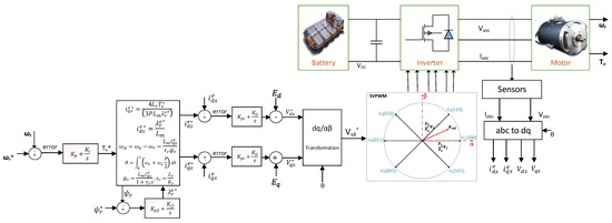 This section describes the analytical modeling of inverter and IM. The closed-loop IM control of a three-phase inverter is developed for EVs. This controller considers outer loop speed control, inner loop flux control, and current control, which has been shown in a block diagram in Figure 5. The controller drives six switches of a two-level DC-AC inverter for tracking the motor’s reference speed, torque, and currents. Such a control strategy is incorporated with a complete dynamic electro-thermal simulation model in MATLAB to analyze losses and temperature performance. After developing the simulation model, the results are compared with real inverter data. The IFOC control design approach and implementation for IM are explained in detail [