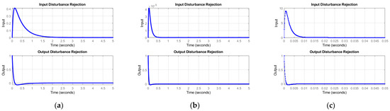 A closed-loop plant transfer function was used to perform a disturbance rejection analysis. The presence of input and output disturbances provided information about the designed controller. When a disturbance enters the system, the disturbance rejection plot could reveal information about the controller’s effectiveness. The system responded quickly to controller disturbances in order to return to a stable state. The closed-loop step response of input and output disturbance rejection of speed control, current control, and flux control is shown in