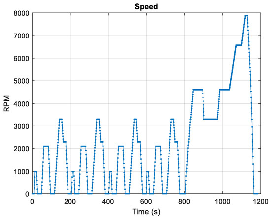 NEDC or other speed profiles can be applied as a reference speed. In this way, the designed controllers’ performance can be investigated. Generally, the speed profile such as NEDC and WLTC are in km/h or m/s. However, the controller takes input reference speed in RPM. Therefore, it is essential to convert from m/s to the RPM using the relation represented in Equation (61). As an example of the NEDC speed profile, the speed of the motor (in RPM) has been attained as an average of both motorized wheel speeds, which is multiplied by a gearbox ratio of 7.13. The NEDC speed profile in RPM is shown in